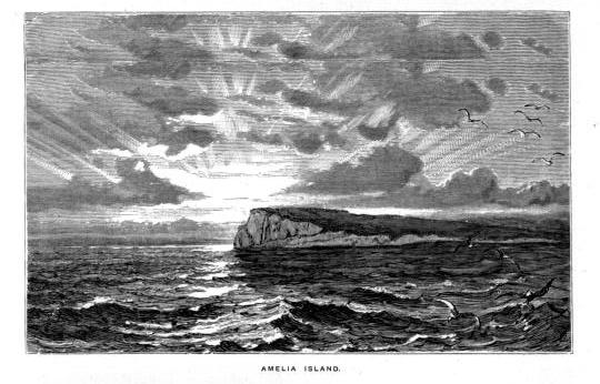 At length we came in sight of a line of sand-hills, with palmetto, pine, and live-oak growing at their summits, while below was a glittering beach, stretching away to the south; and close in front, low banks, over which the white-crested breakers dashed with a fury which made us careful not to get amongst them. To the south was a headland, which our skipper informed us was the north end of Amelia Island. Close to the island was a river of the same name, which united with another stream, the Saint Mary; they together made their way over a bar into the ocean. Crossing the bar, we passed close under the old Spanish Fort Fernandina, and shortly after brought up off a modern city called after the fort, consisting of half a dozen huts. We were now actually in Florida.