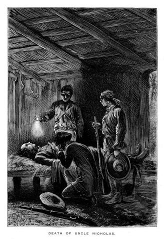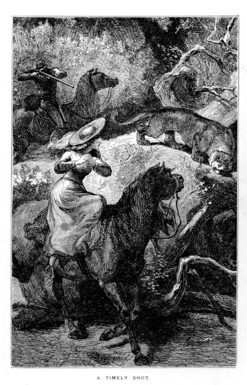 My father was now very anxious to return home as soon as possible, and he invited my two cousins, according to their father’s wish, to accompany him. Juanita was willing enough to go, but Rita showed much disinclination to leave Florida, though, at the same time, she had no wish to be separated from her sister. My father explained that by his brother’s will he had no choice in the matter. He must either take them with him, or remain with them in the country. The property, however, could only be disposed of at a great loss while the troubles with the Indians continued. He proposed, therefore, returning in the course of two or three years to settle their affairs. This arrangement somewhat satisfied Rita, though she still implored me to try and persuade my father to remain. I, as may be supposed, was very willing to do so, as I liked the country, and hoped to meet with more adventures. Rochford was quite ready to remain, for he had every reason to believe that he had won Juanita’s affections. How my father might ultimately have acted I cannot say, for matters were settled in a way we little expected. The sun had set, and we were seated at supper—the pleasantest meal of the day in that hot climate. My cousins had somewhat recovered their spirits, and Rochford was doing his utmost to make himself agreeable, when Tim walked into the room, rifle in hand, with his usual military air, and making a salute, said—