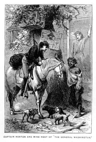 I had nearly stayed out my time at the judge’s, when a hunter belonging to the place, who, notwithstanding the unsettled state of the country, continued the pursuit of game, often at long distances from the settlement, brought word that he had come upon the lately-deserted camp of a considerable body of Indians or blacks. He suspected, he said, from the numerous bones of deer and fowl scattered about, that they were provided with fire-arms and might have some evil intentions towards the settlement. He had followed up the trail, and found them again encamped, but had not ventured near enough to ascertain their numbers and character. He advised, therefore, that a party should be sent out to surprise and disperse them, which he was of opinion could easily be done by surrounding their camp at night. When I heard this account, I was almost convinced that the party were those blacks who had placed themselves under Rochford, and that he, of course, would not permit them to injure the settlers. I did not, however, feel sufficiently certain that Rochford was with them to allow me to express this opinion; but I begged permission to accompany the expedition, which was willingly granted me. It was not expected to last many days, and I hoped still to get back before I was wanted by my father. The Roseville Rifles, commanded by Captain Seth Nockelles, to whom I was introduced by the judge, wore as uniform broad-brimmed straw hats and shooting-jackets, with belts round their waists, in which they stuck their bowie-knives and pistols, while they carried their long rifles slung across their backs. We took with us several powerful blood-hounds, such as I have before described.