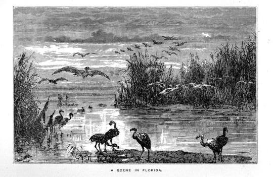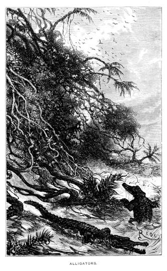 As many of those who read my journal may be unacquainted with Florida, they may like to have a short description of the country. First, as to how it came to be called Florida. It was so named, it is said, by the Spaniard, Ponce de Leon, the first European who landed on its shores on Palm Sunday, 1513, either in honour of the day—Pasqua Florida—or because, being struck by the number and beauty of the flowers which covered the ground, he denominated it Terra Florida, or the Flowery Land. In shape it somewhat resembles a boot. The northern portion, joined to Georgia, is about three hundred miles from east to west; while the rest of the peninsula, which may be likened to the leg, extending from the Atlantic to the Gulf of Mexico, is about one hundred miles across. On both shores are numerous islands and sand-banks. There are neither mountains nor hills even, the greater part of the country rising but a few feet above the level of the sea. It contains, however, a great many lakes and a few rivers. The largest of the latter—the Saint John River—rises far away in the south, frequently expanding during the early part of its course into broad lakes, and in some places closely approaching the Atlantic coast. The southern point of Florida reaches to within twenty-five degrees of the equator, so that the vegetation is of a tropical character. Alligators swarm in the streams and pools; flowering shrubs of rare beauty clothe the banks of every river; and birds innumerable inhabit the forests, lakes, islets sand-banks, and sea-coast.
