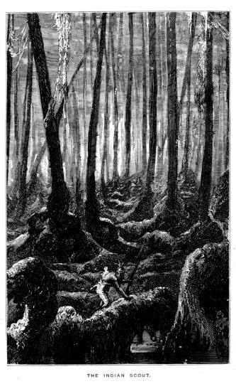 I have already given so many accounts of marches through the country, that I must not fill up my journal with a description either of the scenery or the adventures we met with. At this time a strong force of regular troops had compelled the Indians to evacuate the eastern part of the country, and had, it was supposed, driven the larger number westward, so that we did not expect to meet the enemy in any considerable force. We therefore advanced with confidence, though we sent out scouts, as usual, to avoid the risk of being surprised. We had thus pushed on for four or five days, when one of the scouts brought word that he saw the smoke of a fire ascending apparently from the midst of a thick wood, which was, in his opinion, very likely to shelter an enemy. It was considered advisable, therefore, to enter cautiously, feeling our way as we advanced. As we got to the borders, the dogs were loosened and sent in, and we followed knowing that they would give us timely notice should they come upon an enemy. We had not got far when we heard several shots; but no bullets came near us.