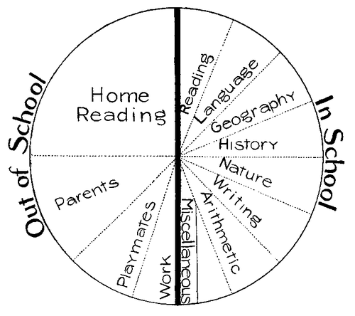 Someone has shown forcibly by a graphic diagram the ideas we are most anxious to establish. In this diagram of Forces in Education, the circle represents the sum total of all those influences which tend to make the mind and character of the growing child. That half of the circle to the right of the heavy line represents the forces of the school; the half to the left, the forces that come into play outside the teacher’s domain. In school are the various studies taught; reading, writing, language, nature, geography, history, arithmetic. Other things such as morals, manners, hygiene, etc., come in for their share of force in the division “Miscellaneous.” Out of school the child’s work influences him; his playmates affect him more; the example and instruction of his parents form his habits, thought and character to a still greater extent; but more than any one, as much as the three [4]combined, does his home reading shape his destiny.