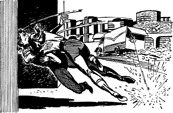 "Look!" She pointed behind him at the wall opposite the door. A wavery line of small, deep holes cut across about heart-high. "I saw the gun-barrel stick out as the truck came up," she explained, untangling herself. "It appears your temporary immunity is over. They're getting active."