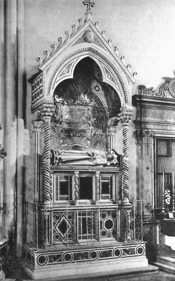There were many men able in sculpture and in architecture at the same time as Orcagna, of whom the names are not known, but their works are to be seen, and these are worthy of nothing but praise and commendation. Among their works is not only the Monastery of the Certosa of Florence, made at the expense of the noble family of the Acciaiuoli, and in particular of Messer Niccola, Grand Seneschal of the King of Naples, but also the tomb of the same man, whereon he is portrayed in stone, and that of his father and one of his sisters, which has a covering of marble, whereon both were portrayed very well from nature in the year 1366. There, too, wrought by the hand of the same men, is the tomb of Messer Lorenzo, son of the said Niccola, who, dying at Naples, was brought to Florence and laid to rest there with the most honourable pomp of funeral obsequies. In like manner, in the tomb of Cardinal Santa Croce of the same family, which is in a choir then built anew in front of the high-altar, there is his portrait on a slab of marble, very well wrought in the year 1390.