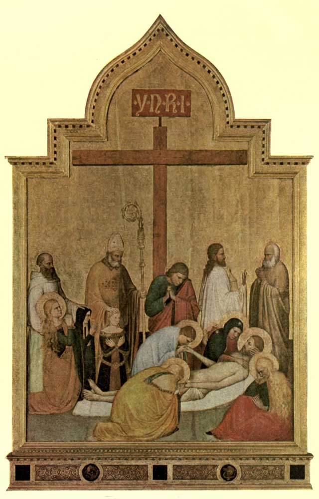 In the cloister of S. Spirito he wrought two scenes in the little arches beside the Chapter-house, in one of which he made Judas selling Christ, and in the other the Last Supper that He held with the Apostles. And in the same convent, over the door of the refectory, he painted a Crucifix and some Saints, which give us to know that among the others who worked here he was truly an imitator of the manner of Giotto, which he held ever in the greatest veneration. In S. Stefano del Ponte Vecchio he painted the panel and the predella of the high-altar with great diligence; and on a panel in the Oratory of S. Michele in Orto he made a very good picture of a Dead Christ being lamented by the Maries and laid to rest very devoutly by Nicodemus in the Sepulchre.