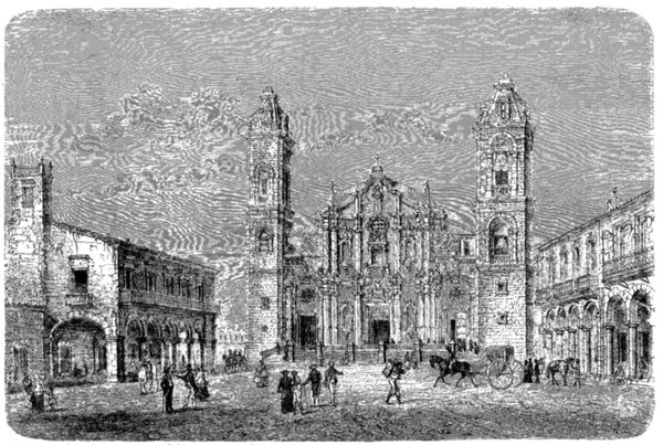 Voici la place d'Armes avec son jardin plein de riches fleurs devant le palais du gouverneur. À un des coins est la chapelle élevée sur l'endroit où, sous les auspices de Christophe Colomb, la messe fut pour la première fois célébrée dans l'île. Nous arrivons au Paseo de Isabel Segunda, grande avenue qui s'étend de la ville à la baie, avec deux promenades parallèles pour les voitures et deux autres pour les piétons, toutes bordées d'arbres en pleine floraison. Nous voici arrivés au théâtre de Tacon, et la volante s'arrête devant une ligne de grandes maisons dont la hauteur contraste avec les autres maisons de la ville, qui sont uniformément à un étage. Nous sommes à l'hôtel Le Grand.