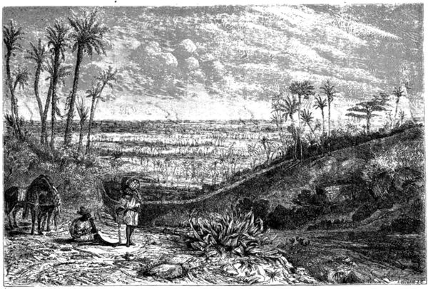 Là-bas, au bout d'une avenue de palmiers, dans un nid d'arbres ombreux, est un groupe de bâtiments blancs entourés d'une mer de champs de cannes à sucre, avec une haute cheminée qui vomit des filets de fumée noire. C'est une plantation de sucre, le premier ingenio que j'aperçoive. Des chars traînés par des bœufs, chargés de cannes, traversent lentement les champs; et autour des maisons, dans les champs, dans toutes les attitudes du travail, on voit les nègres, hommes, femmes, enfants, les uns coupant les cannes, les autres chargeant les chars; c'est une scène d'activité industrielle sous le soleil d'un jour accablant et plein de langueur.