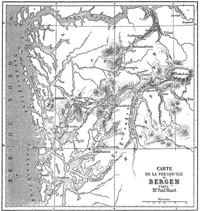 Notre hôte cherche à nous détourner d'aller à Bergen par terre; il nous parle de vingt-quatre heures de chemin. Je mesure la distance sur la carte, je trouve six milles; j'insiste, il finit par se décider et nous trouver trois chevaux, deux guides et un chien. À neuf heures du matin, nous le quittions, comparant sa complaisance et sa franchise honnête avec l'aigreur du prêtre de Vikoër, et nous disions adieu au Hardanger, à ses tempêtes et aussi à ses jolis ports pleins de petits schooners à l'ancre, à ses églises cachées dans les arbres, aux vallées verdoyantes qui viennent déboucher sur ses rives.
