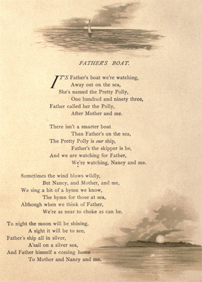 In the first line of the second verse of The Pet Rabbit “than” has been changed to “then”. An apostrophe has been added to the title of “Father’s Boat“ and a hyphen added to “to-night”.