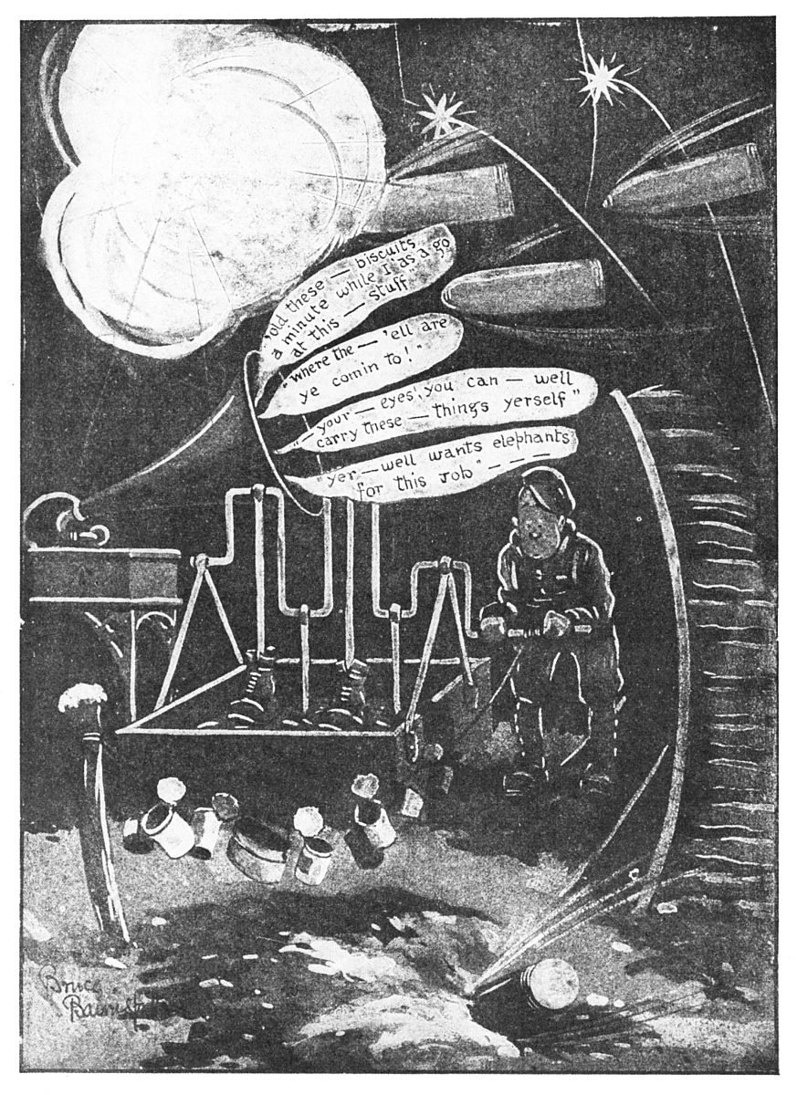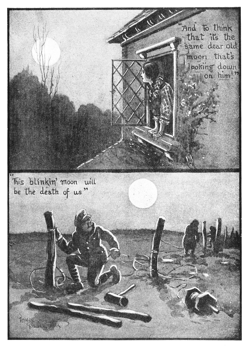 At midnight, an indignant, husky voice is heard to say: "B—— these blinkin' sandbags."