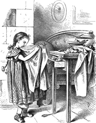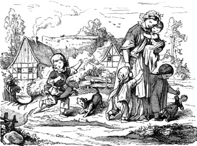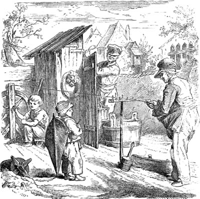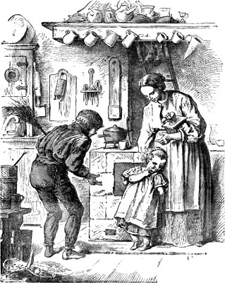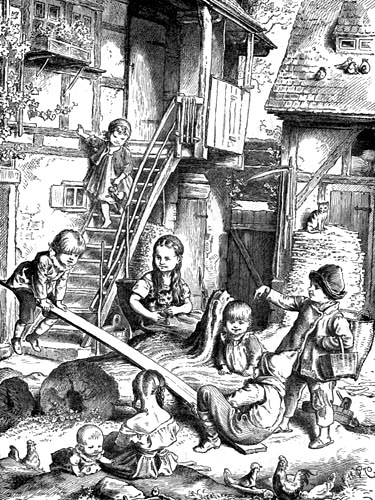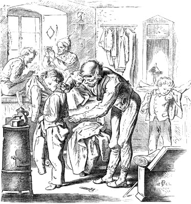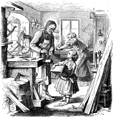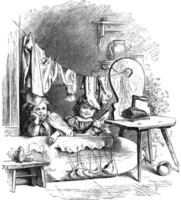 The tailor’s children are having some fun, and, with the help of an old chair and their father’s sleeve-board, have made themselves a shop.