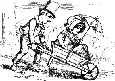 Master Clarence is giving his sister Kate a ride in a wheelbarrow, but, as they are going down-hill, I am afraid she will not have a very comfortable ride, and will be very much jolted. And the next time he takes her out for a ride I hope he will find her something larger and pleasanter to ride in. I dare say she will be very glad to get out and walk presently.