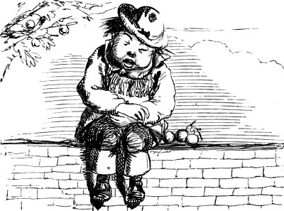 Giles Scroggs is a lumpish farmer’s boy, fat, silly, and lazy. He has but a faint idea of the use of a book, but he understands well the worth of an apple-dumpling. One morning the sly rogue got up very early to steal some apples, but climbing the wall to return he fell asleep on the top, with three rosy apples at his side, just as our artist has drawn him.