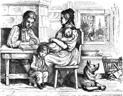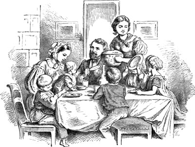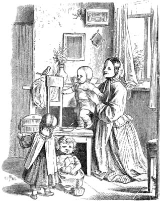 It is breakfast time, and this is a family just seated round the table. One of the little boys has put his plate upon his head, I suppose to attract attention to his wants. Baby stands on mama’s knee, and seems determined he will not be forgotten. Papa will have enough to do to cut bread-and-butter for them all.