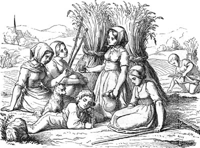It is very hot in the open fields to-day, and the reapers are weary. So they are sitting in the shadow of the sheaves, and are drinking some water, as working in the heat has made them very thirsty. The sun will go down presently, and then it will be cool and pleasant for them to walk home over the fields.
