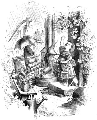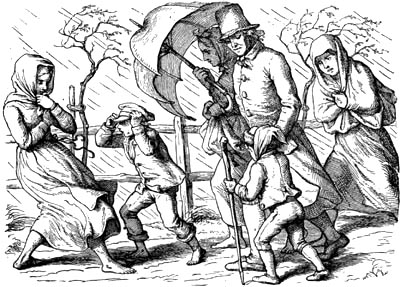 How it rains! I am afraid our party in the picture will all be wet to the skin. It is a pity they have only one umbrella among them, and they have a long distance to go before they reach home. It was fine when they started, so they were not prepared for such a storm. But perhaps it will soon be fine again.