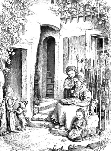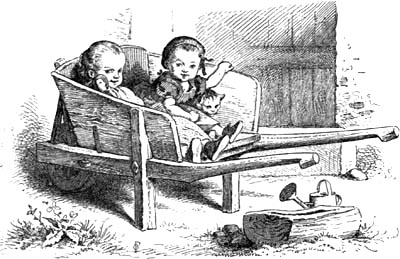 It is half-holiday to-day, but it is too warm to run about the fields. So Susan and Emma are sitting in the wheelbarrow, at the kitchen door, and enjoying themselves as much as if they were sitting in a fine arbour. They have got puss with them, who seems to like it as much as they do. When the sun sets they will water their flowers, for they have got a nice flower-bed of their own, and some of the flowers are just beginning to blossom.