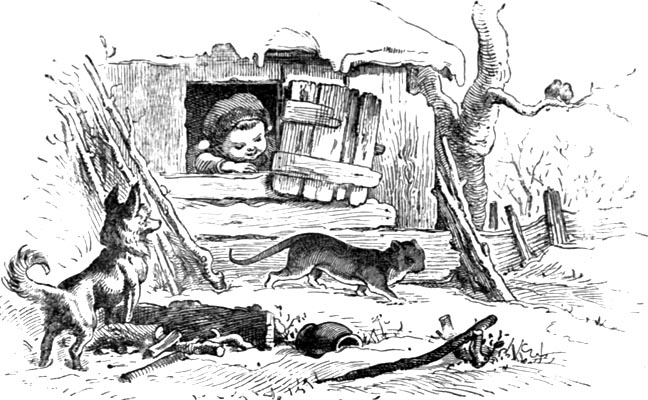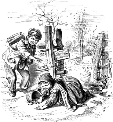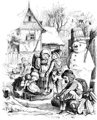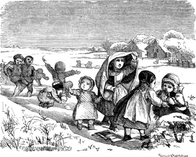 It is very cold, and the fields are all covered with snow. The children are on their way to school, but they have laid their books down for a few minutes. The boys are in high glee, for they cannot make snow-balls every day, and there is plenty of snow on the ground just now. I dare say they will be sorry when the snow melts.