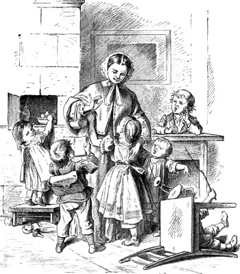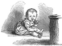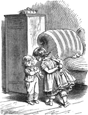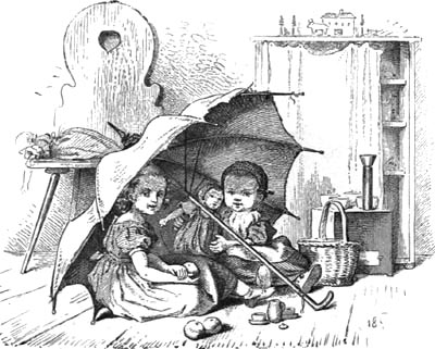 Little Emma and George have shut themselves into an up-stairs room this morning, and are pretending to be papa and mama. They have got papa’s great boots on the floor, and Emma has dressed the boot-jack like a doll, and placed mama’s bonnet on her head. Mama down-stairs will wonder presently what has become of her two little pets.