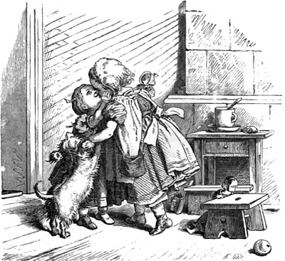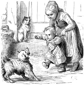 Susan has long been expecting her little cousin from the country, and she has just arrived. When Susan has done kissing her, she will tell her how glad she is to see her, and show her her pretty doll and her playthings. The dog too is jumping up at her and barking, as though he would give her a welcome also.