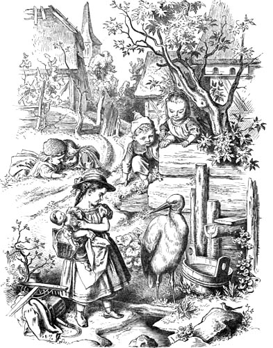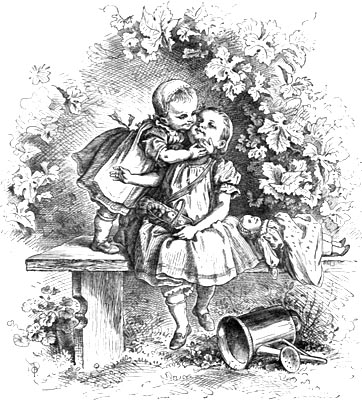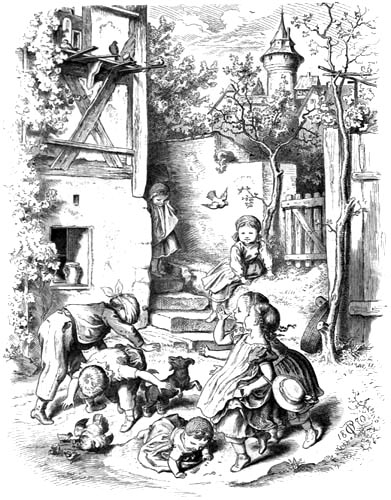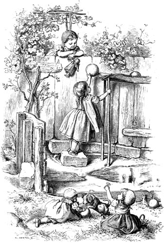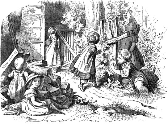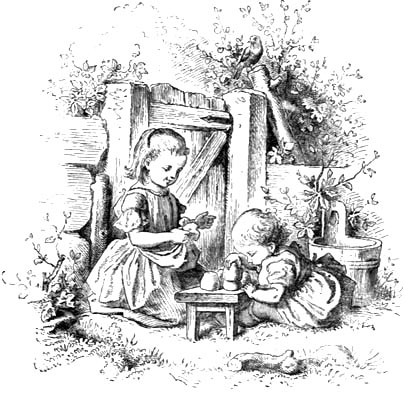 Julia is playing with her young brother in the garden. The little bird perched up there is looking as if he would like to play with them too. He has a nest in the trees behind, but I dare say he thinks the children are too kind and gentle to molest his pretty little family.