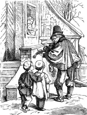 Poor old man! He is playing away merrily, though I dare say he is tired, and has perhaps walked many a mile this hot day. If he does not play very well, his music pleases the baby at the window. Here, poor man, is a penny for you.