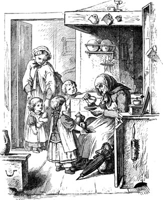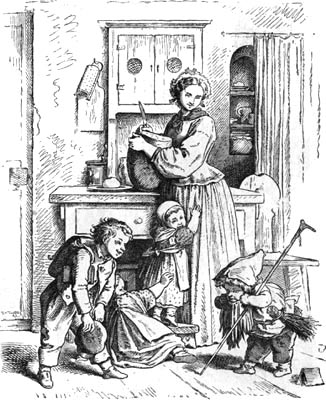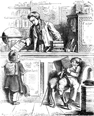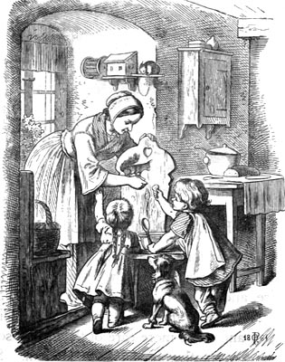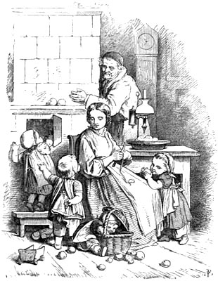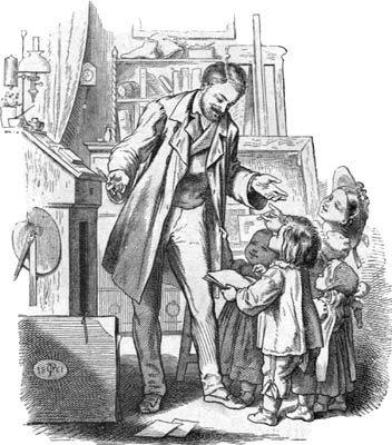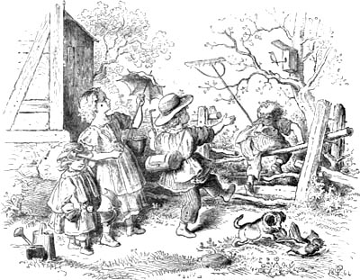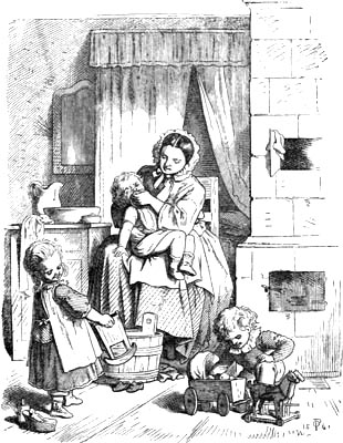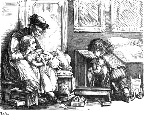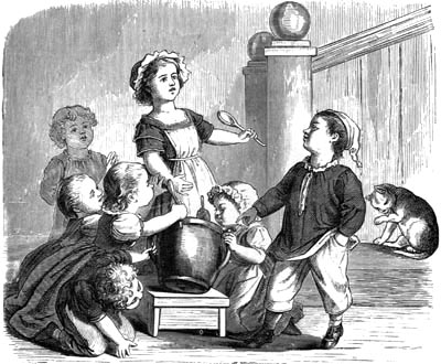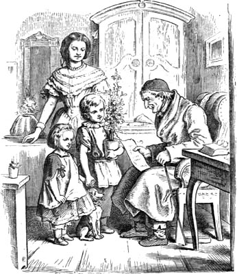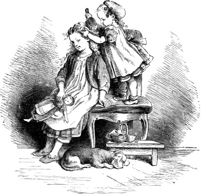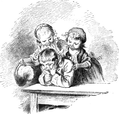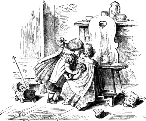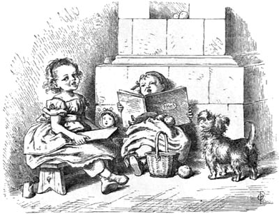 The children have got papa’s music books, and are pretending to sing from them. Even dolly is stuck up against the wall, as if she were one of the singers. The dog is listening, as though he would ask what is the meaning of all this strange noise, and is barking, himself, very dismally, to add to it.