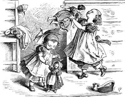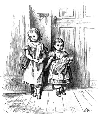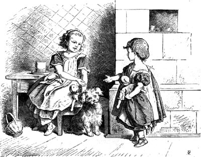 The two cousins are each of them tired of their own doll, and are wanting to exchange. But they do not seem to like to trust one another, and so each is holding out her hand to the other, and neither of them seems willing to give her doll first. Even the dog looks as if he was surprised at them.