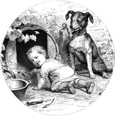 Baby is sitting in the out-house eating a piece of bread-and-butter. Bob is putting his paw gently upon him, as much as to say, “Don’t forget me, baby, but give me a bit, please.”