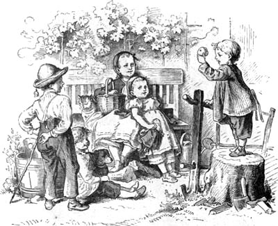 Reuben is a clever little boy, and for his age knows very much. He has mounted a tree-stump in the garden, and is asking his brothers and sisters some questions. Whoever gives him the best answers is to have that nice apple he is holding up. They all seem puzzled, even the dog and cat.