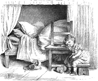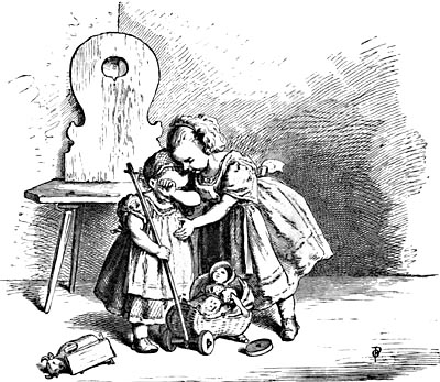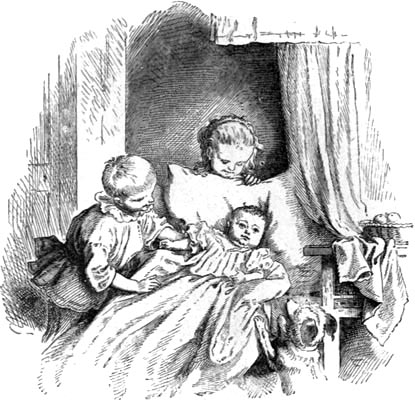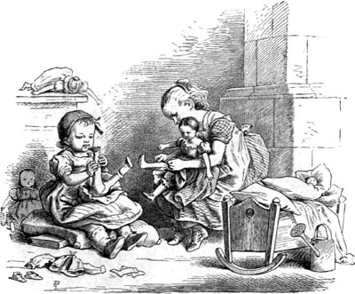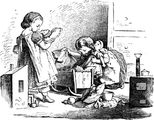 The two little sisters are making a great fuss just now about their sick dolls. They have been making something warm for them, and are now about to put them to bed in the cradle. One of them is being hushed to sleep. They are taking pains to have the mattress smooth and well shaken up, so that the dolls may have a soft bed. But I am afraid the cradle is not quite big enough for both of them, and if so they will not be very comfortable.