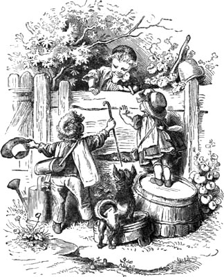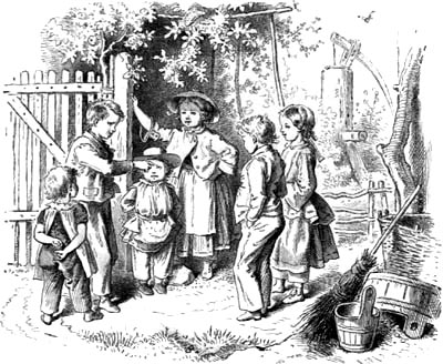 Tom has fastened the gate, and is laughing at his little playfellows, because they cannot get over the palings to him.