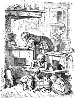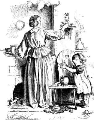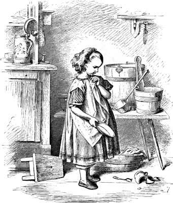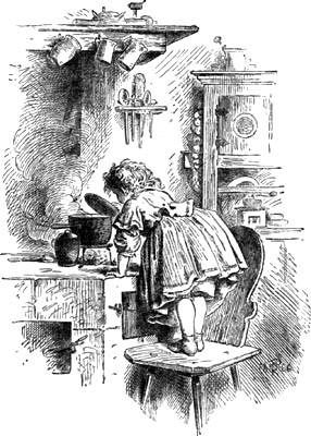 Mama has just gone out of the kitchen, and Miss Pry is looking to see what is in the stew-pan. This is very naughty.