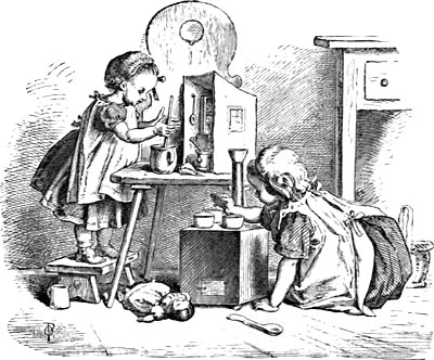 Lucy and Jane are fond of playing at cooks, and seem very busy this morning. Lucy is standing on a stool stirring something in a pot, and Jane is watching the cups on the little stove. I hope the children will not burn themselves, nor make a mess on the floor, or mama will be very cross.