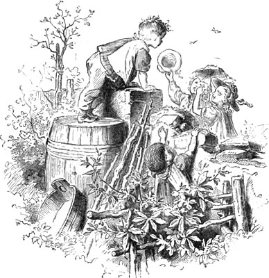 What a daring little boy that young Edward is! He has climbed to the top of the wall, and his young cousins are cheering him. I hope he will not fall, and hurt himself.