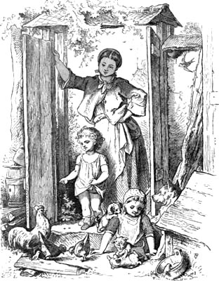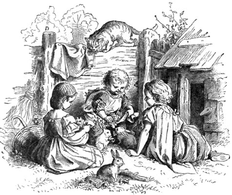 The children are busy in the yard this morning feeding the rabbits. They have opened the rabbit-hutch, and are going to give the rabbits some fresh vegetables. The cat behind is looking slyly on, as though she would like to pounce down among them.