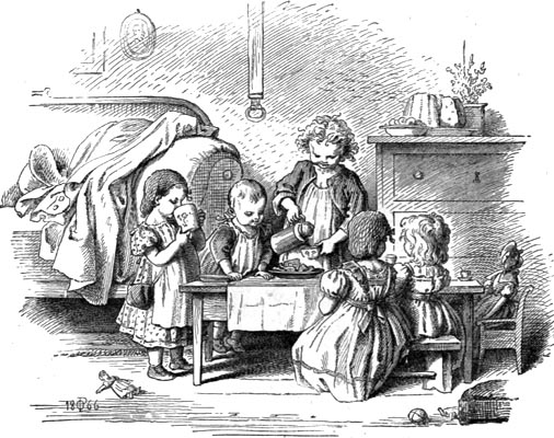 Little Bertha is having a tea party. The children have been playing, and now they are having tea, and Bertha is pouring it out for them. Even dolly is seated at the table, but they have forgotten to take her bonnet off. When tea is over they will go out and play in the garden.