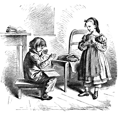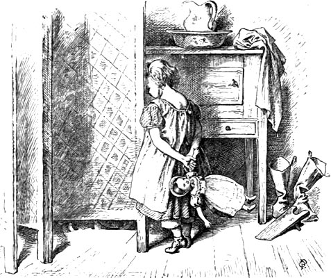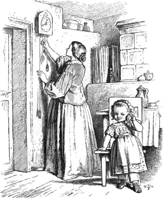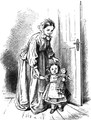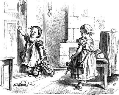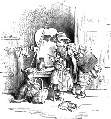 The clock has just struck, and Amy, with her school satchel behind her, is just bidding good-bye to her little sister. She wanted to tell her how to dry her doll’s clothes, but she cannot stay now.