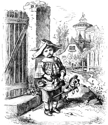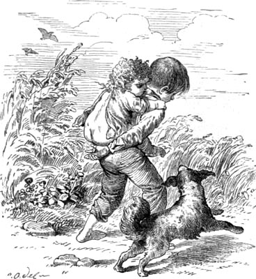 Baby is having a ride this morning on his brother’s back. It is a rather rough ride, and shakes him very much when his brother runs. But he likes the fun, and will be sorry when his brother is tired, and puts him down. Carlo is barking beside him with all his might.