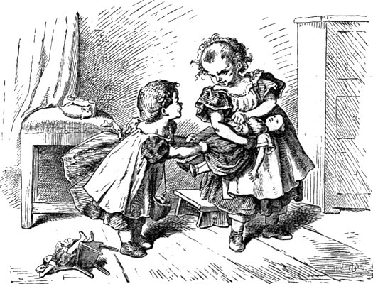 This is a sad scene. The two little sisters are quarrelling over their playthings, and I am afraid the dolls will get damaged in their angry strife. The little lamb lies upset on the chair, the little dolly is sprawling on the floor, and the dress of the bigger one will certainly be torn. It is a pity the two sisters should quarrel in this manner, and about such trifles too.