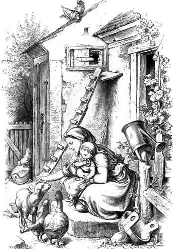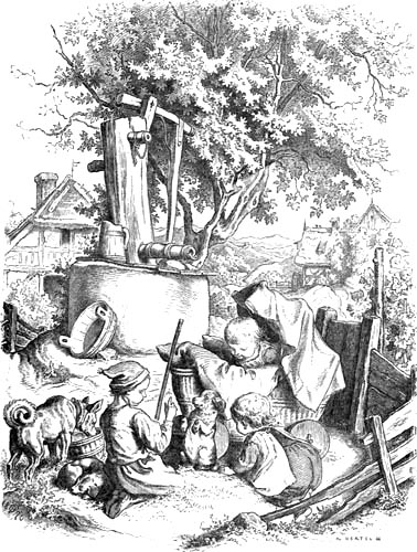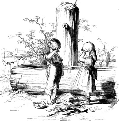 The children are up early this morning getting some water at the pump. The geese are watching them, as if they were longing to have a little of it. Perhaps the little girl will give them some when she has filled her jar, for she is very thoughtful for dumb animals, and they all like her very much, and follow her about. It is a good sign when children are kind to animals.