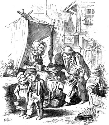 The children are buying some fruit at the fruit stall. Poor little Richard and his sister are walking sadly away, for they have no money.