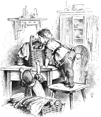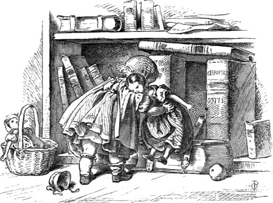 Baby has strayed up into a spare room, where papa keeps some of his old books, and she is having rare fun here all by herself. She has brought up her two dolls, one of which she has seated in a basket, and is finding a seat for the other on a great old clasped book. Papa little thinks what baby is about, but I dare say she will be missed presently, and then they will find her very busy up here.