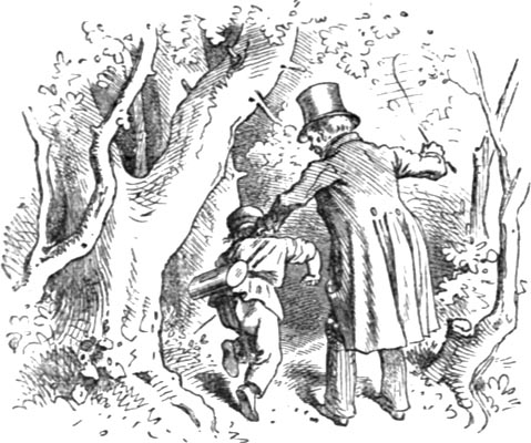 Master Andrew has just been caught by the old gentleman, who is giving him a few smart strokes with his cane. I am glad of it, for he is a mischievous lad. He was sent to school just now, but instead of hastening there he thought he would stroll through the plantation and see if he could find any birds’ nests. Now the old gentleman is very fond of his birds, and will not have them molested. Hearing the crashing of the boughs, he soon discovered the offender, and after a short chase caught him. This beating serves Andrew right, and I hope he will in future leave the poor birds alone.