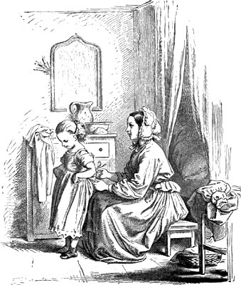 Mama is plaiting Ellen’s hair this morning, and then she will be ready for school. Though her toys are on the floor beside her, yet she stands quite still, like a good girl.