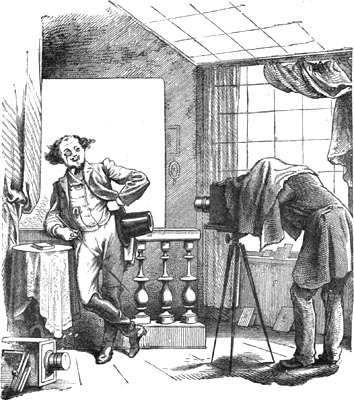 The squire has called at the studio to-day to have his carte taken, and the photographer is placing him in the best position.