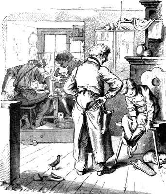 The tinman is very busy to-day, with his little hammer, shaping a piece of tin. On the floor around him lie watering-pots, coffee-pots, tin pipes, and a variety of useful articles, all made out of tin.