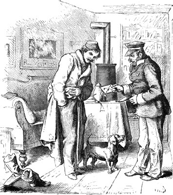 A messenger has just brought the student a letter. The dog is looking at the man rather suspiciously.