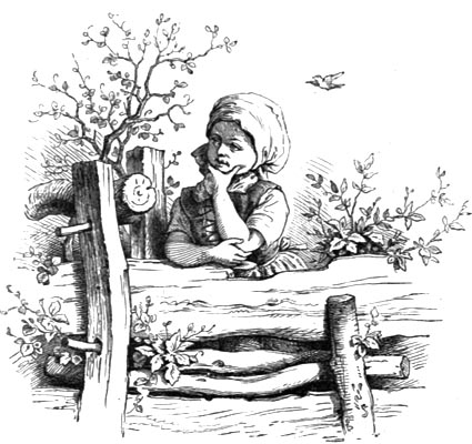 Little Hester is leaning on the palings this afternoon, with her head on her hand, as if in a deep study. I wonder what she is musing about. I dare say if the little bird above her could speak he would ask her the subject of her thoughts. I hope they are good, hopeful, cheerful thoughts, and I think they are, judging from her serene and happy countenance.
