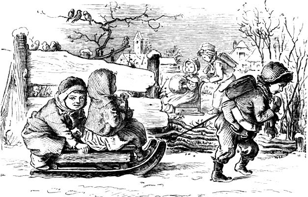 It is a cold winter morning, and the children are amusing themselves by riding in a sledge over the frozen snow. The birds are huddling together on the bare branches, as if they felt the cold very keenly. It is pleasant, no doubt, for the riders, but whether it is for our little friend who is drawing the sledge, I am not sure. At all events, it will warm him this cold morning, and that will no doubt do him good.